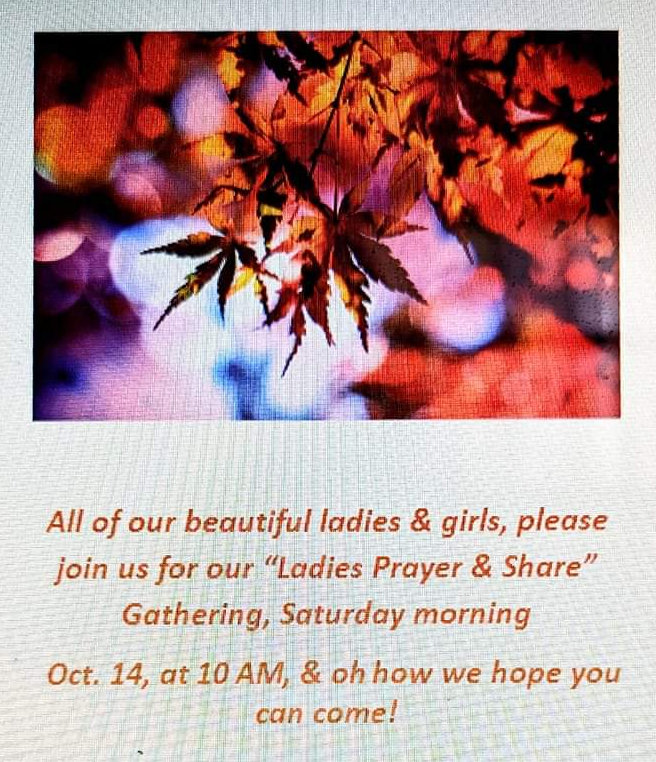 Join us for our monthly men and women's fellowship Saturday, October 14th 2023.