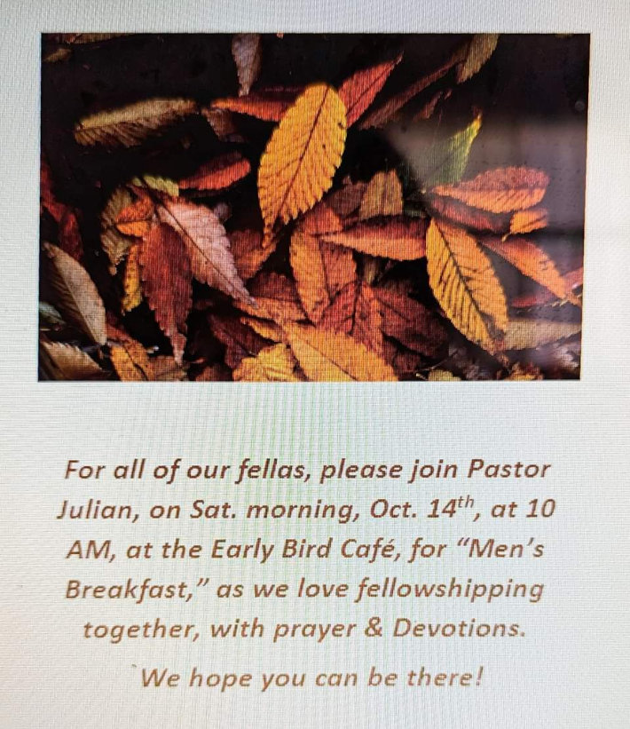 Men and boys will meet at the Early Bird Cafe for prayer and fellowship at 10:00 AM.